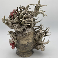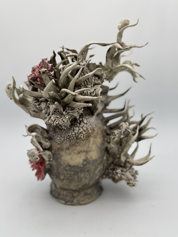clay, custom glaze, gold lustre, natural detritus