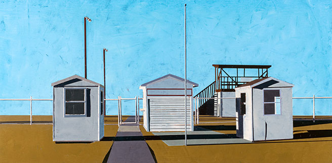 Of his work Bradley-Shoup states, in part: Ugly Beauty is one of Thelonious Monk’s only known waltzes. It is a delicately sweet and slow tune with an underlying sense of melancholy. The term ugly beauty is a reference to the French expression “Jolie-laide”, which literally translates to “pretty [and] ugly”, or more loosely, the concept of presuming there is beauty to be found in flaws or less-pleasing features. This body of work explores the notion of “jolie-laide” as well as our shared modern landscape. My gaze tends to be fixed often on abandoned and derelict structures, vacant structures that are to be reassigned another function, and others that are awaiting purchase for their first assignment. It is this transitional state, otherwise known as liminal space, that I am deeply connected to. When a space loses its proposed function it goes into stasis, it becomes liminal. The word liminal comes from the Latin word “limen”, which when translated means “threshold”—in other words, on the precipice of change, stuck in a constant state of transition. My perspective has been informed from a young age by the silent refined background art of animation’s Golden Age, from Looney Tunes, to Tom and Jerry, and Disney. When you strip away the characters from each scene an exquisite silent and abandoned liminal space is revealed.