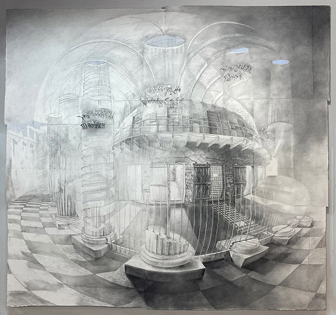 Of his work Dimick states, in part: I started this series with the painting "Leave-Taking", juxtaposing an institution of learning on the left with one of incarceration on the right, I was thinking about how education is a privilege and a tool for advancement and critical thinking. The French philosopher Michel Foucault explained how the Panopticon—the round prison with the guard tower in the middle—is a metaphor for not only being surveilled, but also the kind of learning we do to surveil ourselves. I then spent two weeks drawing inside of Eastern State Penitentiary in Philadelphia. Designed by a Quaker architect who thought that isolation would bring inmates closer to God, the practice of isolating inmates has since been documented to hasten mental illness. Eastern State was our country’s first penal institution to use solitary confinement on a large scale and stands today as an architectural ruin and museum. The slow process of observational drawing provided me an opportunity to be present in the penitentiary for a sustained period and to reflect on its historical importance. My works are personal meditations and not intended as journalism. By uniting disparate spaces via complex and intuitive spatial systems, the language of objectivity is made elastic and released into a poetic realm of patiently built worlds of suspended reality.