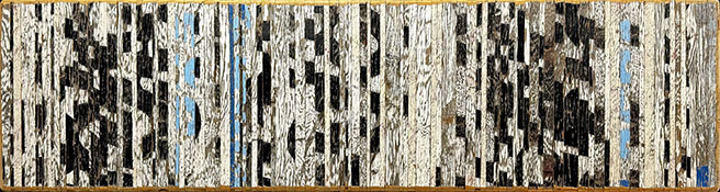 Of her work Cooke states, in part: In the summer of 2005 Hurricane Katrina barreled through and upended the lives of the residents of the Gulf Coast. My own clay studio was buried in a toxic soup of water and mud, and the next two years were spent cleaning and renovating both it and my home. Finally able to return to art-making, though in a studio now devoid of a kiln, I began creating mixed-media works focused on my experience of the city that had gone through such large-scale disaster and upheaval. This show at Manifest Gallery includes one of the last ceramic pieces I created before the storm. After having been a clay artist for 35 years, I decided to try a new medium, turning my attention to the 1950’s Singer Featherweight sewing machine that I had inherited from my late Aunt Imogene. I am concerned with notions about the push and pull of energy, with order and chaos, and what is often an unseen or hidden interior world. I refer to these works as strata and core samples, borrowing terms from scientific geologic exploration, to suggest slices, stratification, veins, cross-sections, or samplings of some micro/macro whole with a mysterious origin. The desire to look within, behind, and underneath, to question where a thing came from and what it may mean, is paramount to human curiosity and to the mystery of being human itself. Within the realm of this exposed core there lies the possibility of revelation of spirit, inviting meditation, contemplation, and visual exploration.