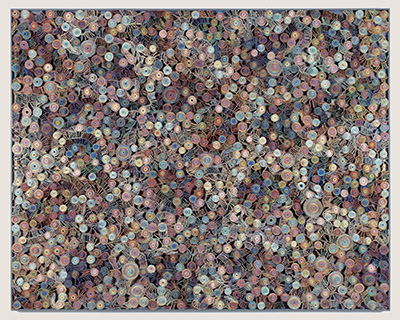 Of her work Adams states: A ring on the coffee table left from a glass of water, a canyon-like divot in the sheet of a bed, or the impression left on one’s soul by words softly exchanged; such traces of our daily activities are left by each experience we have and action we take. They range from subtle to monumental in both observation and opinion. Sometimes, the more subtle the impression, the more beautiful. As a painter, I explore the over-looked marks people leave in their beds while sleeping. Referencing photos sent to me by loved ones, I hone in on areas that resonate with me. They look like cascading rivers, valleys, or even roads journeyed through our dreams. These intimate marks, sculpted in fabric, are ephemeral fossils. They are impressions of memory, nocturnal landscapes. Through painting, composition and creation, I honor each nocturnal recharge and journey.